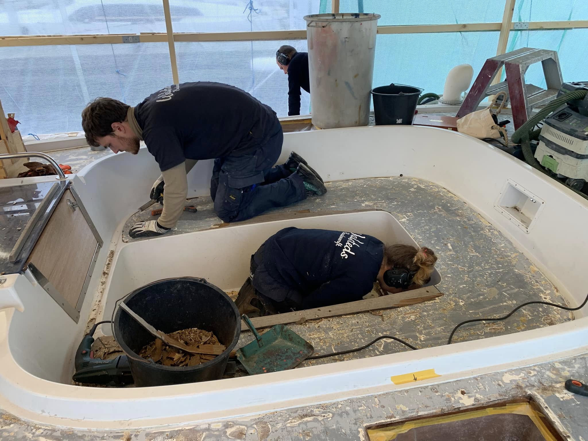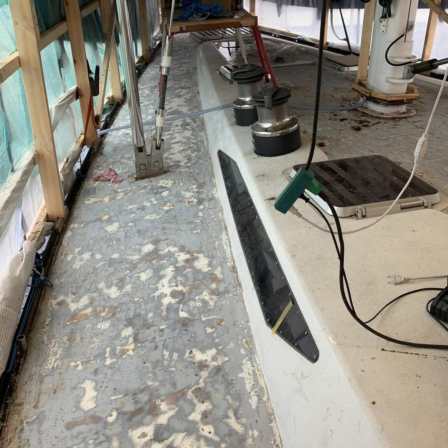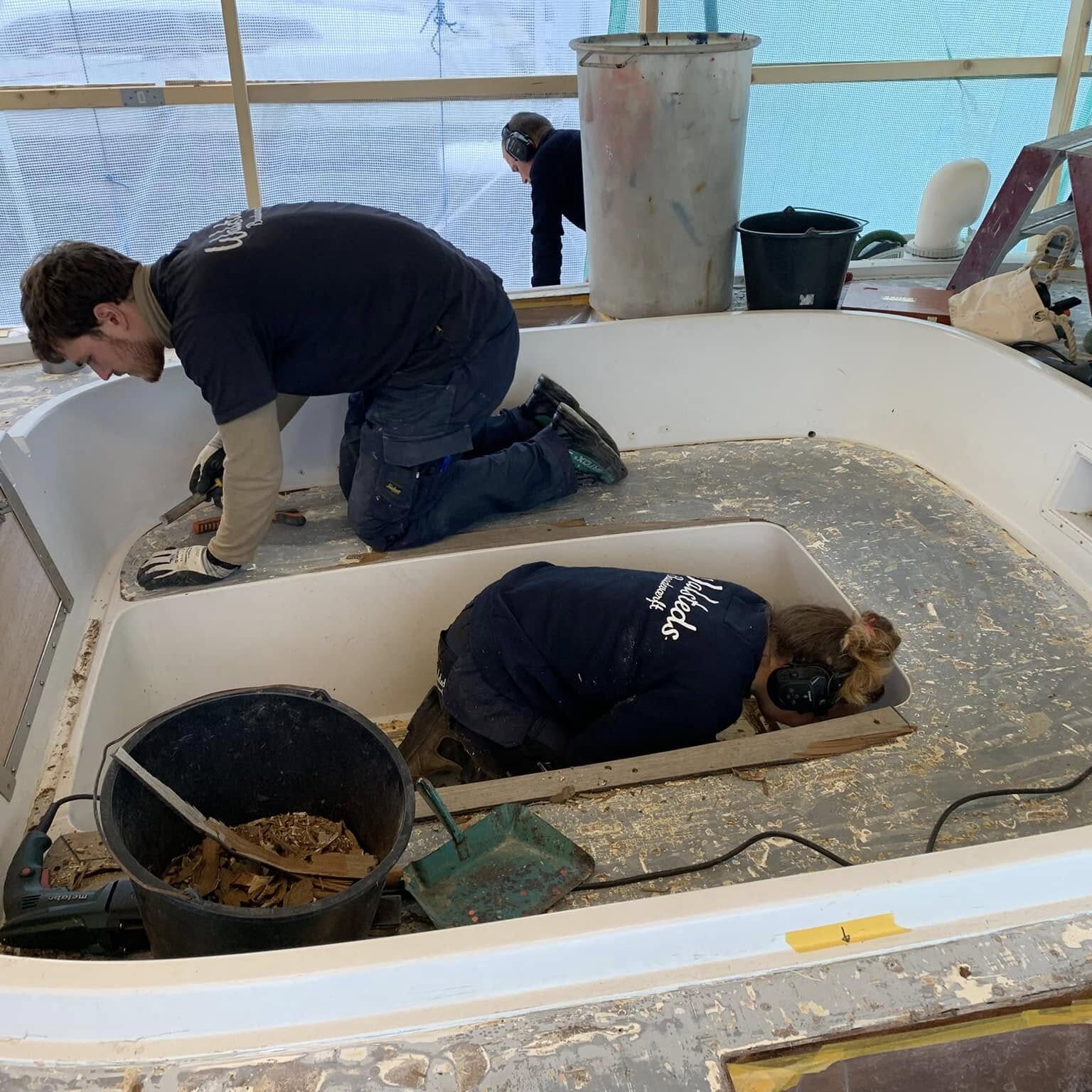 De unge mennesker Ann Katrine, Bjarke og Jonas knokler på, for at få det sidste af teak dækket af på en Baltic 64, næsten i mål