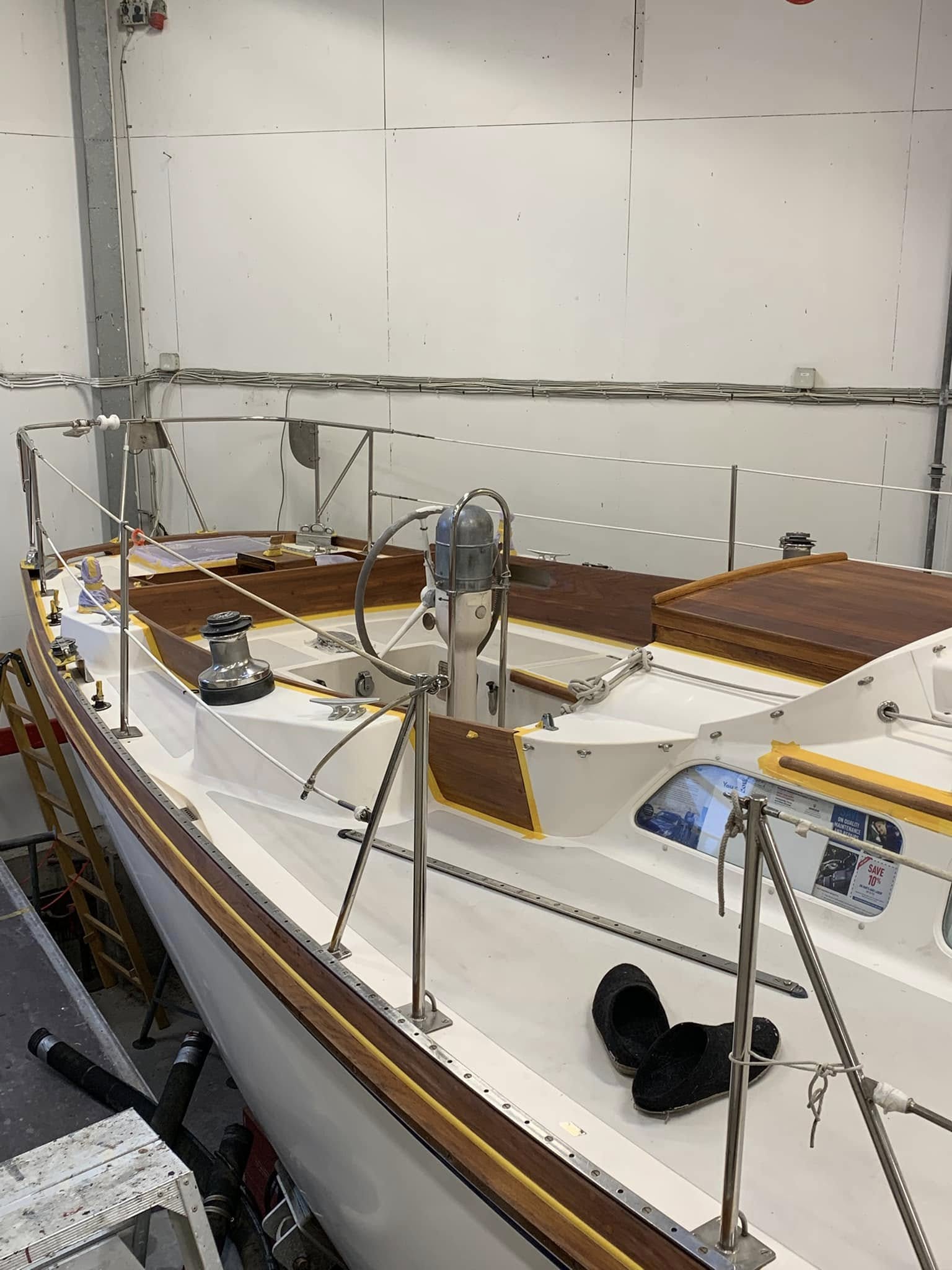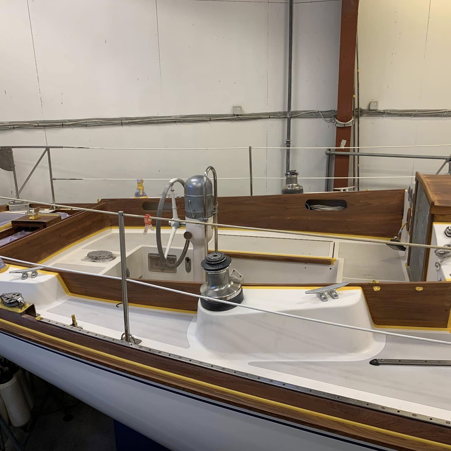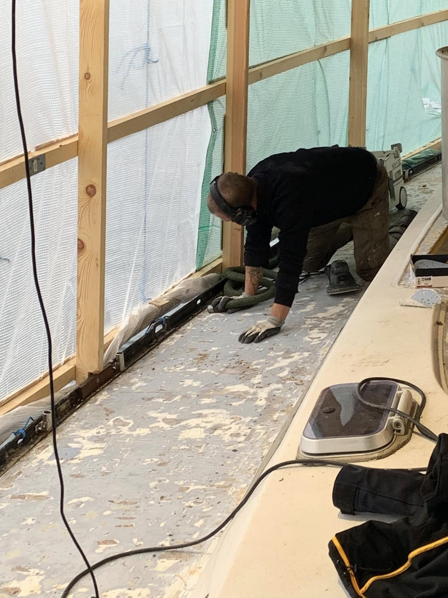 De unge mennesker Ann Katrine, Bjarke og Jonas knokler på, for at få det sidste af teak dækket af på en Baltic 64, næsten i mål