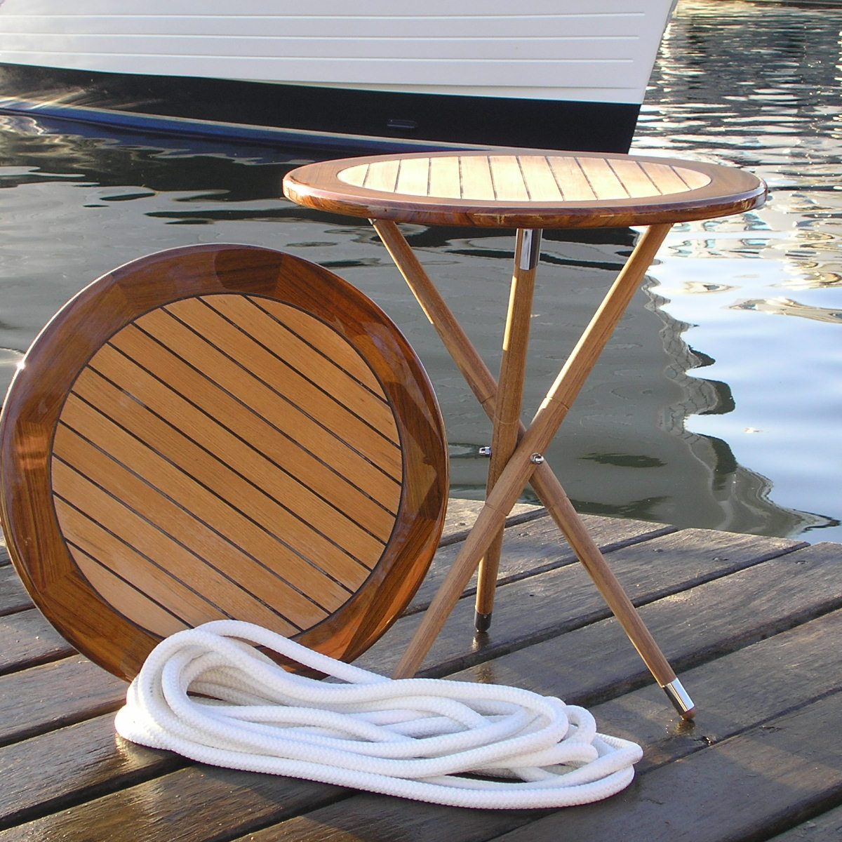 Det viste café/cocktail bord er et elegant bord udført i teak. Bordets diameter 620 mm, højde 700 mm.
